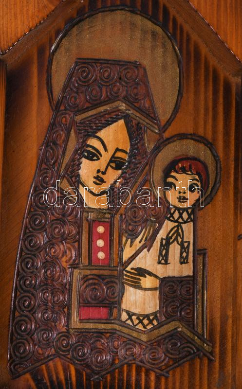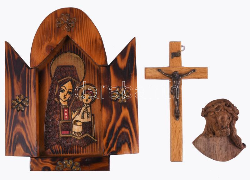 Leírás: 3 darab fa kegytárgy dísz, h: 24 cm alatt