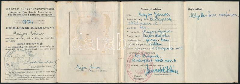 1945. november 6. Izraelita tanuló részére kiállított ideiglenes cserk... https://www.darabanth.com/hu/513-Filatelia-kepeslap-numizmatika-mutargy-konyv-papirregiseg-ekszer-aukcio/513.0/Mutargy-papirregiseg-egyeb/Judaika~86/1945-november-6-Izraelita-tanulo-reszere-kiallitott-ideiglenes-cserkesz-igazolvany~II3469018
