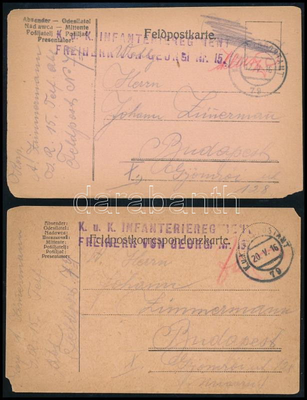 Leírás: 1916 A cs. és kir. 15. gyalogezred tagjának 2 db tábori posta levelezőlapja, "K. u. K. Infanterieregiment Freiherr von Georgi Nr. 15." bélyegzéssel