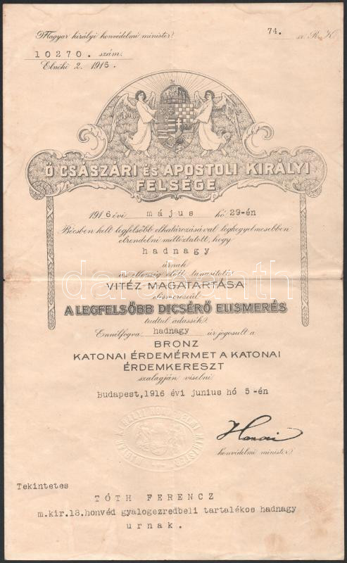 1916 Bp., "Bronz Katonai Érdemérem a katonai érdemkereszt szalagján" kitüntetés adományozó oklevele Tóth Ferenc, a m. kir. 18. honvéd gyalogezred tartalékos hadnagya részére, báró Hazai Samu honvédelmi miniszter nyomtatott aláÃrásával, szárazbélyegzÅ‘vel, kissé foltos, 34x21 cm