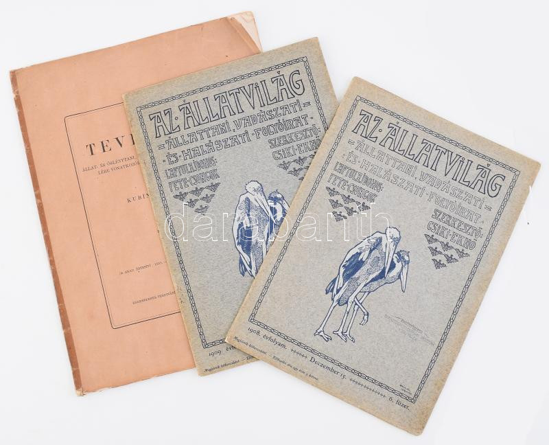 1862 Kubinyi Ferenc: A teve és a ló. Állat- és őslénytani, s a magyarok keletről eljövetelére vonatkozólag történelmi tekintetben. Képatlasz. Pest, Eggenberger Ferdinánd (Rohn és Grund-ny.), 7 t. Kiadói papírkötés, sérült borítóval, kissé foltos, helyenként kissé sérült lapokkal. + 1908-1909 Az állatvilág. Állattani, vadászati és halászati folyóirat. Szerk.: Csiki Ernő. 1908. évf. 6. füzet és 1909. évf. 3. füzet (2 db). Kiadói tűzött papírkötés, néhány kijáró lappal, ex libris-szekkel.