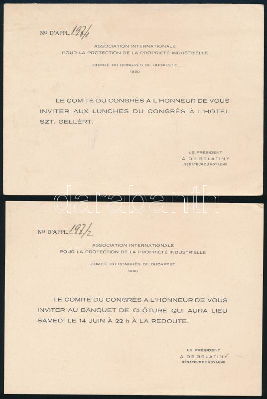 1930 Bp., meghívók az "Association Internationale pour la Protection de la Propriété Industrielle" kongresszusi bizottságának a Szent Gellért Szállodában tartott zártkörű ülésére, 5 db, az egyik ebédre/vacsorára jogosító kuponokkal