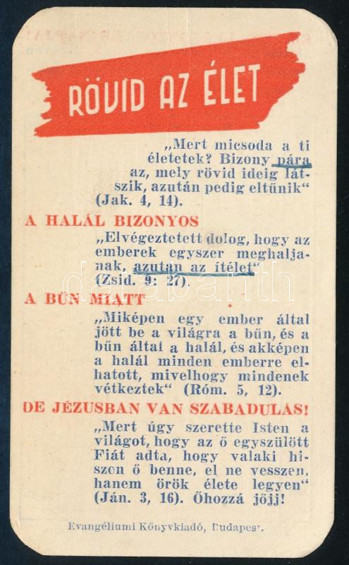 1948 "Rövid az élet" - az Evangéliumi Könyvkiadó kártyanaptá... https://www.darabanth.com/hu/513-Filatelia-kepeslap-numizmatika-mutargy-konyv-papirregiseg-ekszer-aukcio/513.0/Mutargy-papirregiseg-egyeb/Nyomtatvanyok~1023/1948-Rovid-az-elet-az-Evangeliumi-Konyvkiado-kartyanaptara~II3470726
