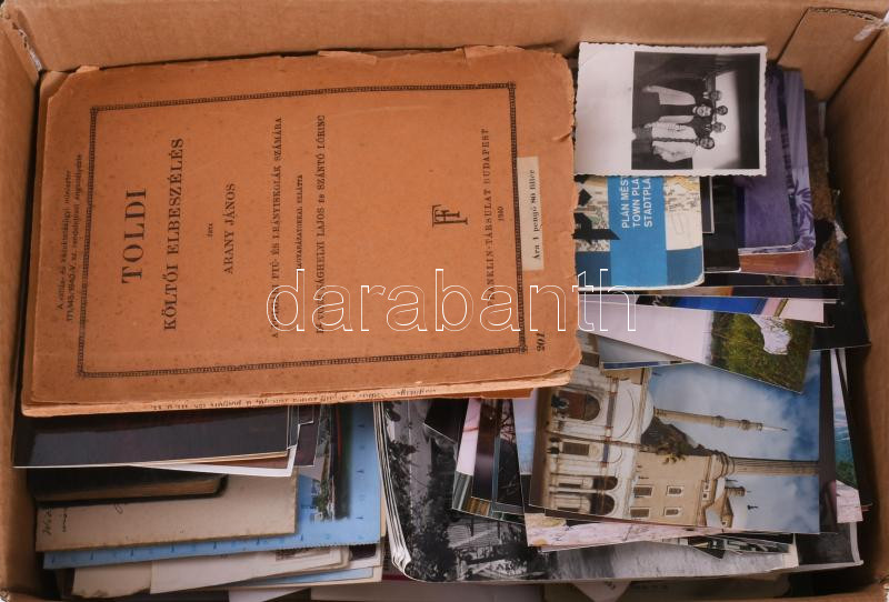 Leírás: Közepes doboznyi papírrégiség, benne képeslap, térképek, újságok, cca 250 db fotó, prospektusok, nyomtatványok, katalógusok.