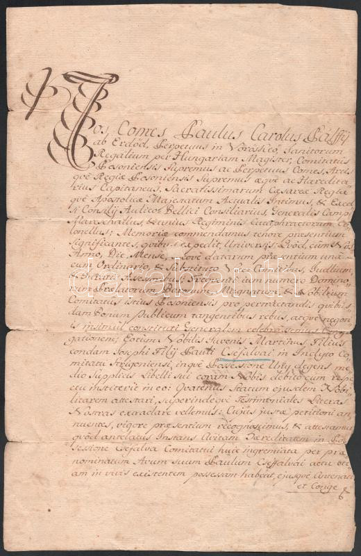 Leírás: 1767 Losonc, Cséfalvay családi nemesi oklevél, szakadásokkal