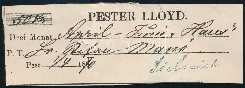 Leírás: 1870 Pest, Pester Lloyd újság előfizetési nyugta