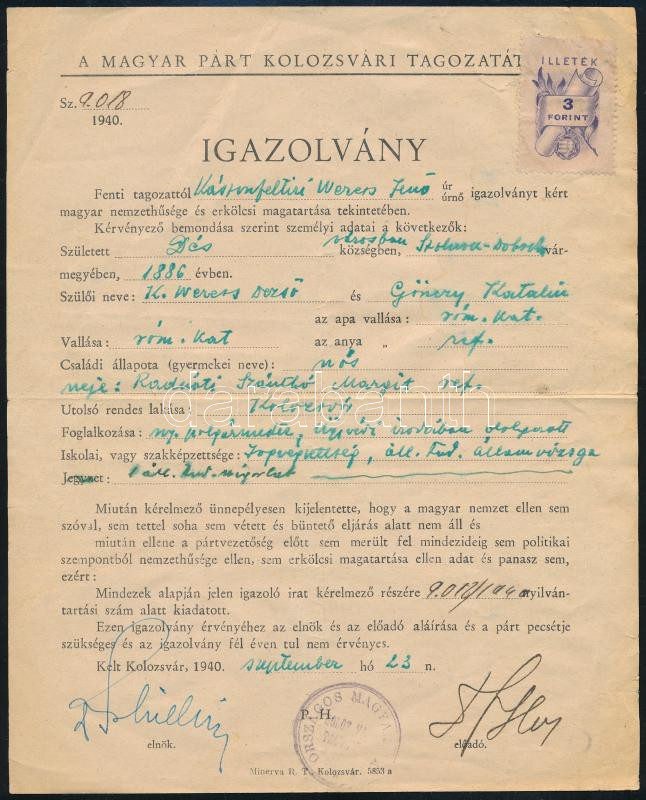 1940 Kolozsvár, a Magyar Párt kolozsvári tagozata által kiállított igazolvány "magyar nemzethűség és erkölcsi magatartás tekintetében", 3Ft illetékbélyeggel
