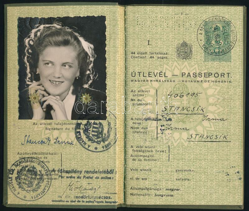 1941 Bp., A Magyar Királyság által kiállított fényképes útlevél szlová... https://www.darabanth.com/hu/513-Filatelia-kepeslap-numizmatika-mutargy-konyv-papirregiseg-ekszer-aukcio/513.0/Mutargy-papirregiseg-egyeb/Okmanyok~80/1941-Bp-A-Magyar-Kiralysag-altal-kiallitott-fenykepes-utlevel-szlovak-vizummal~II3467785