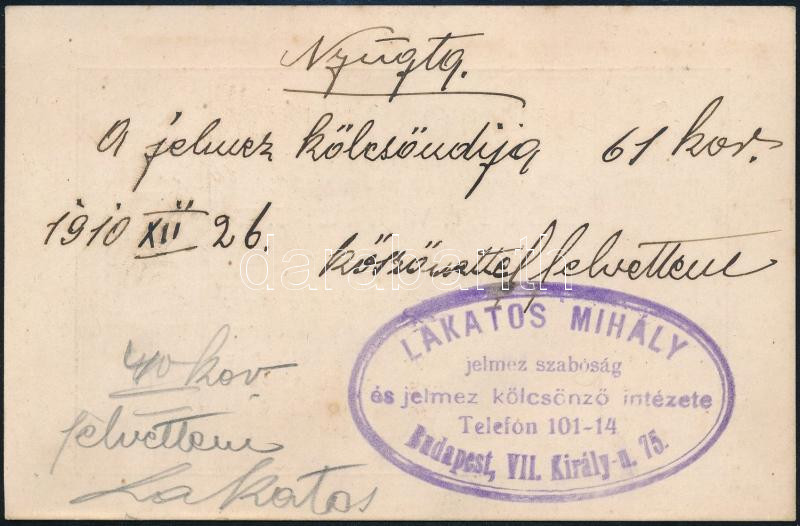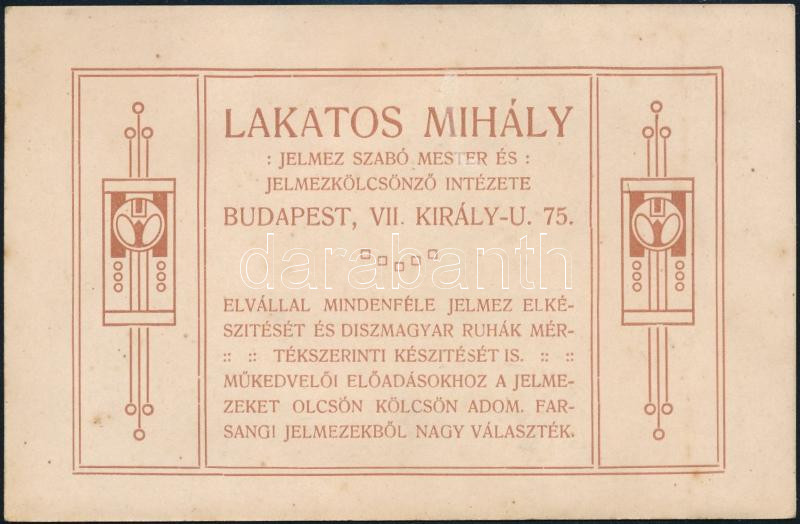 1910 Bp., Lakatos Mihály jelmez szabó mester és jelmezkölcsönző intézete (VII., Király u. 75.) szecessziós reklámlap, hátoldalán kézzel írt nyugta, 9x14 cm
