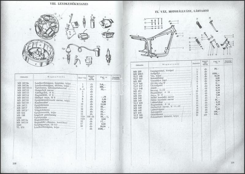 Leírás: Pannonia 250 cm2-es tlt és tlf típusú motorkerékpár alkatrészek árjegyzéke