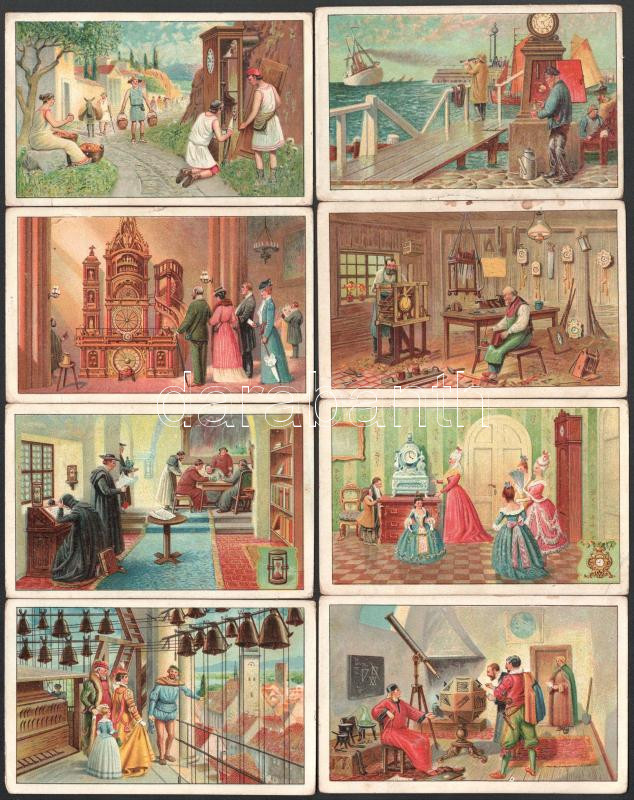 Leírás: cca 1900 Az óratípusok fejlődése a középkortól, a Franck kávépótló litografált reklámlapjai, hátoldalon leírással, 8 db, jó állapotban