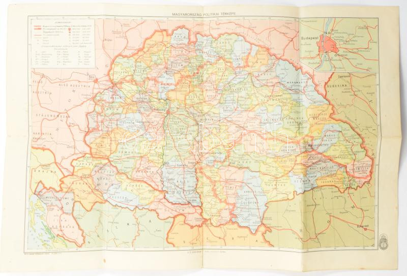 1942-ban kiadott közigazgatási térképünk a teljes történelmi Magyarországot ábrázolja; az 1938-as, 1939-es, 1940-es és 1941-es diplomáciai és katonai műveletek nyomán létrejött új határvonal feltüntetésével. Hátoldalán a domborzati, vízrajzi térképpel. lapunk az 1918-ig érvényes megyebeosztást tartalmazza. a bukovinai székely települések esetén magyar megnevezésekkel), . A jobb felső sarokban Budapest melléktérképe. Hajtva