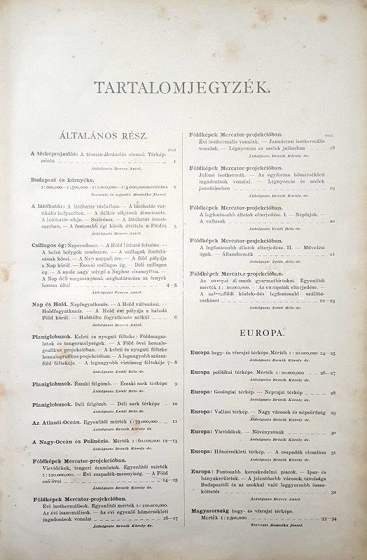 A Magyar Földrajzi Társaság megbízásából készített, grandiózus színes atlasz a legfrissebb domborzati, politikai, közlekedésföldrajzi, gazdasági, néprajzi és meteorológiai adatokat teszi közzé művészi kivitelezésű térképein. A térkép tervezése és kivitelezése nyolc éven keresztül zajlott, csaknem valamennyi térkép magyar térképészek munkája, a legtávolabbi vidékekről rajzolt térképek kivételével, melyek a szerkesztő bizottság tüzetes átnézése alá kerültek. A Magyarországról készült térképek egyedi gazdagságban mutatják be hazánk geológiáját, domborzatát és vízrajzát; közigazgatását és közlekedését, gazdasági potenciálját, népesség-eloszlását és etnikai összetételét, egyes városait és agglomerációit. Az 1906-ban kiadott atlasz a pillanatnyi politikai helyzetet tükrözi: Európa területén még főként birodalmak osztoznak, a birodalmi méretű nemzetállamok Afrikáért és Ázsiáért folytatott versenyfutása, miként az Afrika és Ázsia átnézeti térképein tanulmányozható, nagyrészt befejeződött. Európai részletként elmondható, hogy a Bosznia 1908. évi annektálása előtt készült atlaszunk Balkán-térképen Bosznia és a Szandzsák ugyan elkülönül, ám Törökország még mindig tekintélyes birtokokkal rendelkezik; a török területekért kirobbanó háború 1912-től borítja lángba a félszigetet, illetve a Balkán-háborúk során szerzett nemzeti sérelmek és ellentétek hozzájárultak az első világháború kitöréséhez.