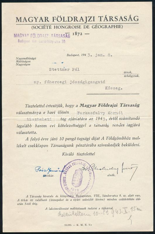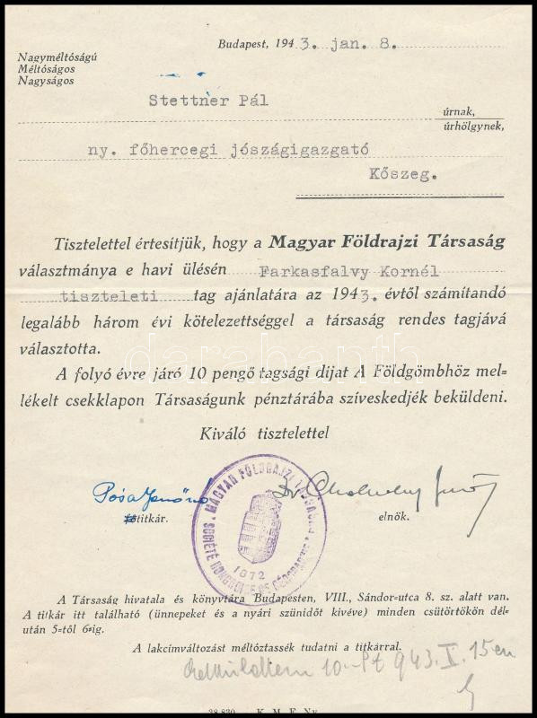 1943 Magyar Földrajzi Társaság értesítése Kőszegre, Stettner Pál ny. főhercegi józságigazgató részére, hogy a társaság rendes tagjává választották. [Ormos Jerne] Pósa Jenőné (1902-?) titkár (1941-1945) és Cholnoky Jenő (1870-1950) Magyar Földrajzi Társaság elnöke (1914-1945), földrajztudós, író, a magyar geográfia legnagyobb tudósainak egyikének aláírásaival.
