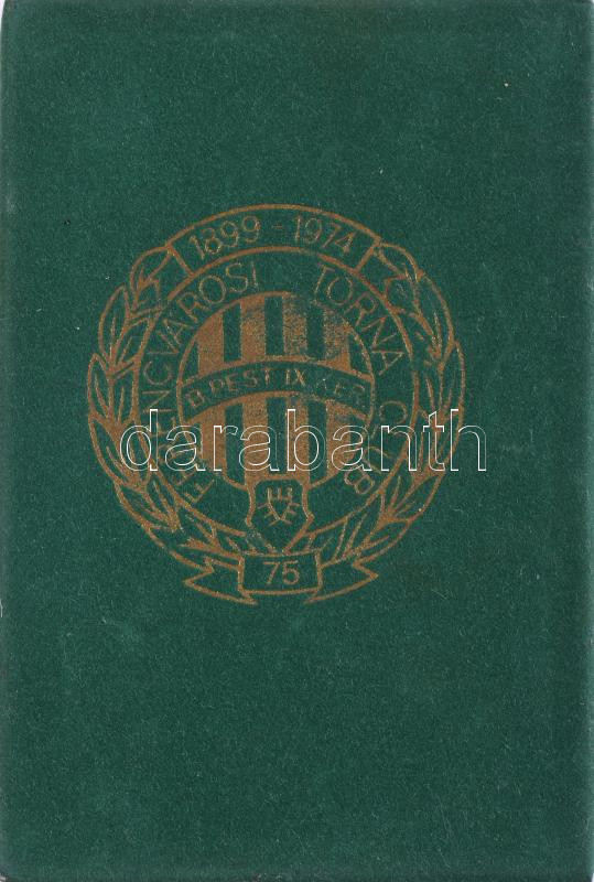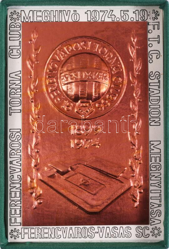 Leírás: 1974. "Ferencvárosi Torna Club 1899-1974" meghívó lemezplakett az FTC Stadion megnyitása alkalmából, eredeti tokban.