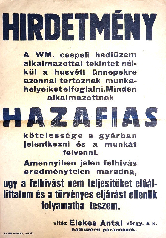 [Aprónyomtatvány] Vitéz Elekes Antal hadiüzemi parancsnok felszólítása a Weiss Manfréd hadiüzem dolgozói számára azonnali munkafelvételére. (1944 április).