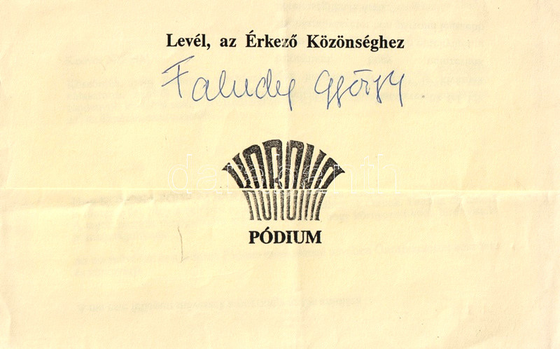 A tiltott szerzőnek számító Faludy György 1988-ban látogatott újra Magyarországra. Szamizdatban megjelent verseskötetei jelentős érdeklődést generáltak, melynek nyomán az év során több szerzői estet is szerveztek számára, így lépett fel a budai Korona Pódiumban is. A Korona Pódium (szokásainak megfelelően) elhelyezte meghívójában a művész aláírására szolgáló számlálócédulát, ennek előoldalán Faludy György saját kezű aláírása, a művész azonban aláírását megismételte a Korona Pódium meghívólevelének előoldalán is.
