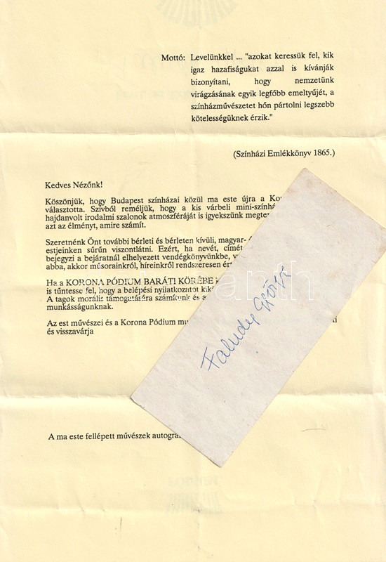 [Kézirat] Faludy György (1910-2006) költő két, saját kezű aláírása a budai Korona Pódiumban megrendezett szerzői estje alkalmából. (1988 körül).