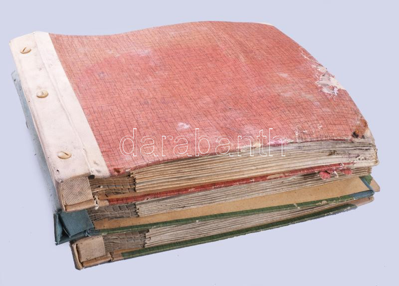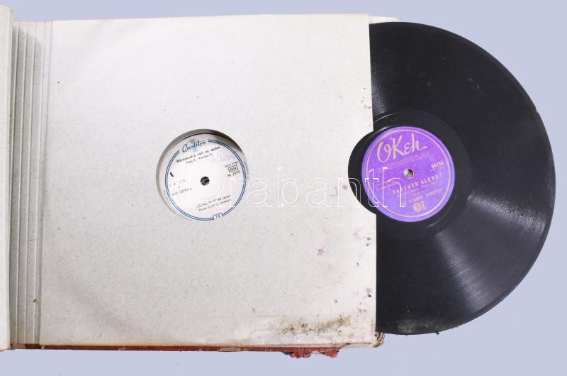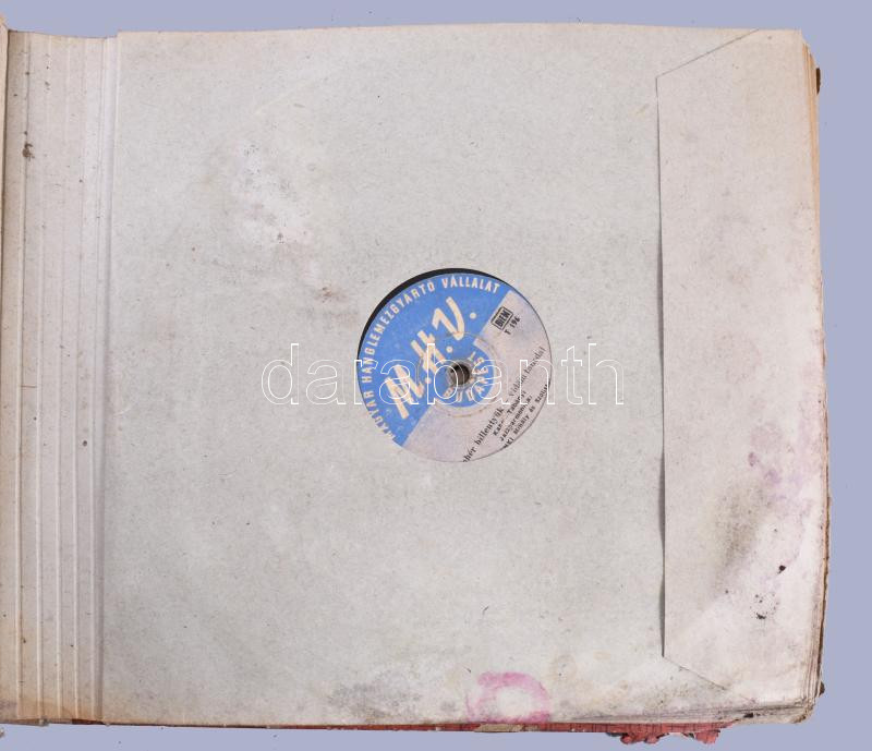 Leírás: 34 darab gramofon lemez, tartókban, kissé ázott.