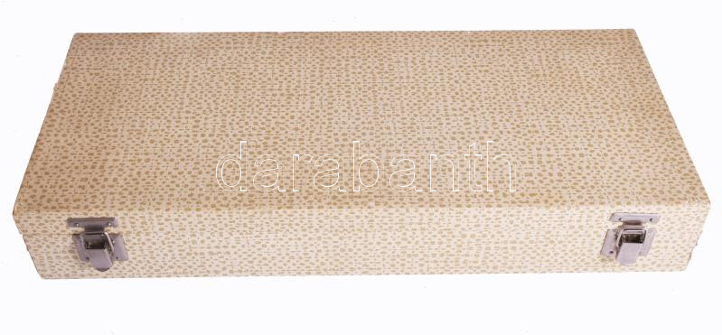 Leírás: Ezüst (Ag) evőeszköz készlet díszdobozban, jelzett Dianás 6+6 villa, Latzkó mesterjeggyel. Nettó 686 g + ezüst nyelű kések 12 db