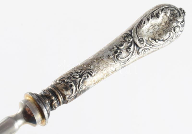 Ezüst (ag) nyelű tálalóüvilla, sérüléssel, h: 25 cm https://www.darabanth.com/hu/513-Filatelia-kepeslap-numizmatika-mutargy-konyv-papirregiseg-ekszer-aukcio/513.0/Nemesfem-disztargyak-ekszerek-dragakovek/Nemesfem-disztargyak-ekszerek-dragakovek~1022/Ezust-ag-nyelu-talalouvilla-serulessel-h-25-cm~II3470064
