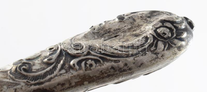 Leírás: Ezüst (ag) nyelű tálalóüvilla, sérüléssel, h: 25 cm