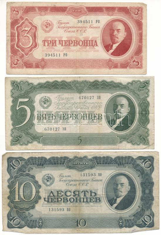 Soviet Union 1937. 1 Chervonetz... https://www.darabanth.com/hu/513-Filatelia-kepeslap-numizmatika-mutargy-konyv-papirregiseg-ekszer-aukcio/513.0/Numizmatika/Kulfoldi-bankjegyek~723/Szovjetunio-1937-1Ch-plus-3Ch-plus-5Ch-TF3Cbr-3E-Soviet-Union-1937-1-Chervonetz-plus-3-Chervontsa-plus-5-Che~II3464917