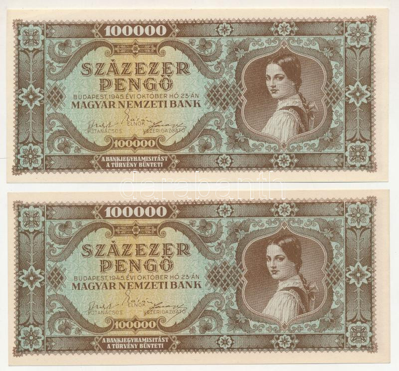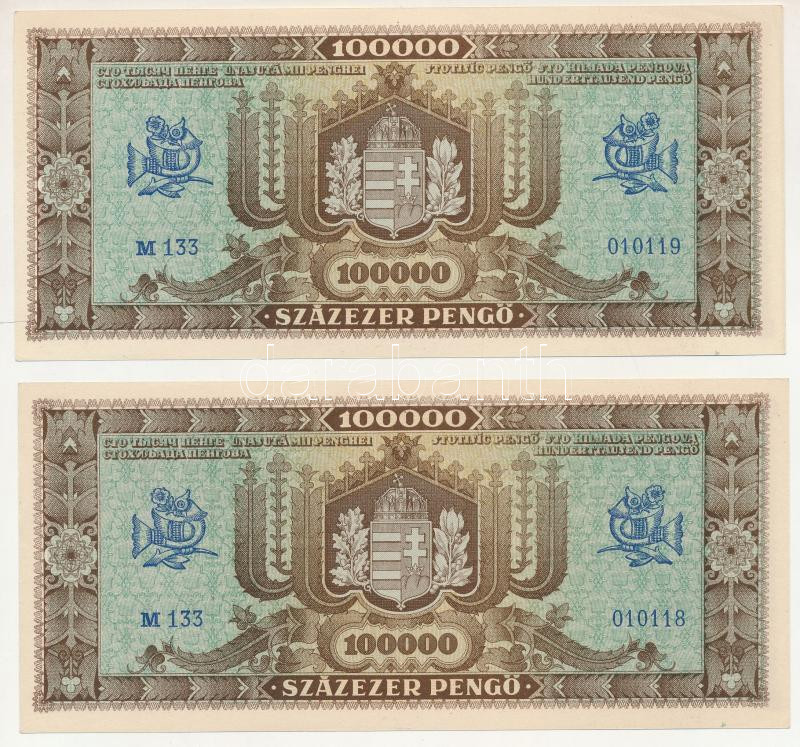 Leírás: 1945. 100.000P (2x) sorszámkövetők "M 133 010118 - M 133 010119" T:UNC,AU