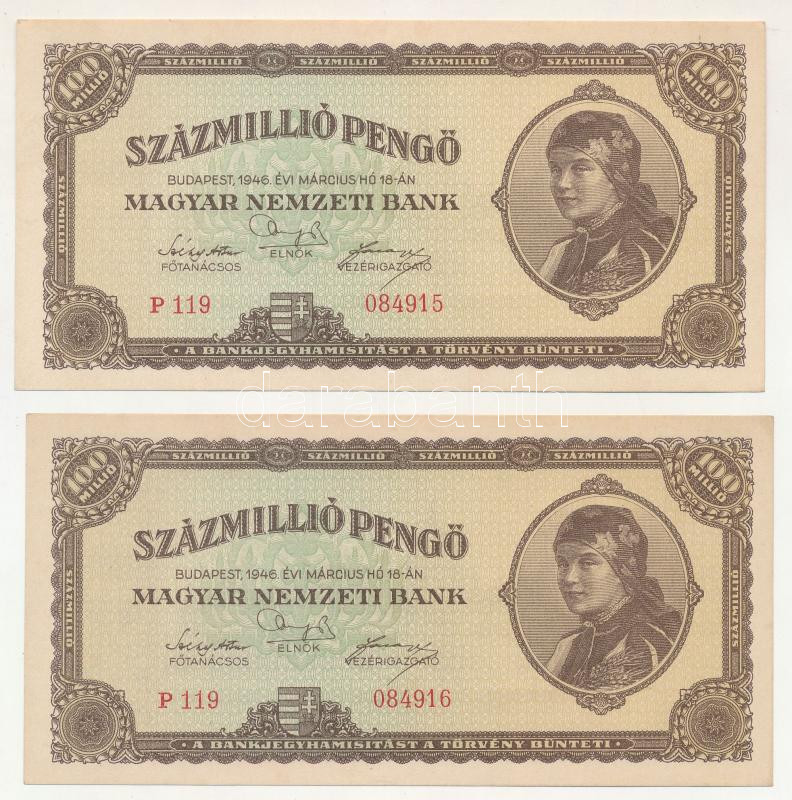 Leírás: 1946. 100.000.000P (2x) sorszámkövetők "P 119 084915 - P 119 084916" T:AU