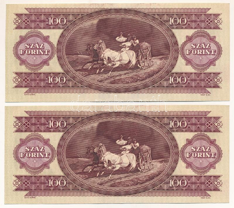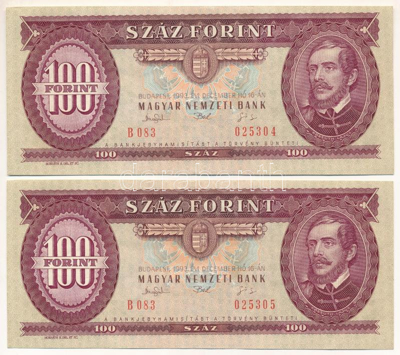 Leírás: 1993. 100Ft (2x) sorszámkövetők "B 083 025304 - B 083 025305" nyomdai festékfoltok T:XF