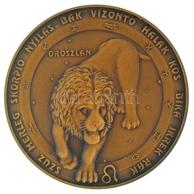Leírás: Kósa István (1953-) DN "Oroszlán " egyoldalas bronz horoszkóp emlékérem kapszulában, dísztokban (42,5mm) T:UNC