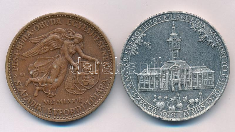 Leírás: Lisztes István (1942-) 1973. "MÉE - Jászberényi Csoport / Pest-Buda-Óbuda egyesítésének századik évfordulójára" kétoldalas, vert, bronz emlékérem (43mm) + Lapis András (1942-) 1979. "MÉE Kilencedik Vándorgyűlése - Szeged / Szeged pusztulásának és újjászületésének centenáriumi évében " ezüstpatinázott kétoldalas, vert, bronz emlékérem (43mm) T:AU-XF