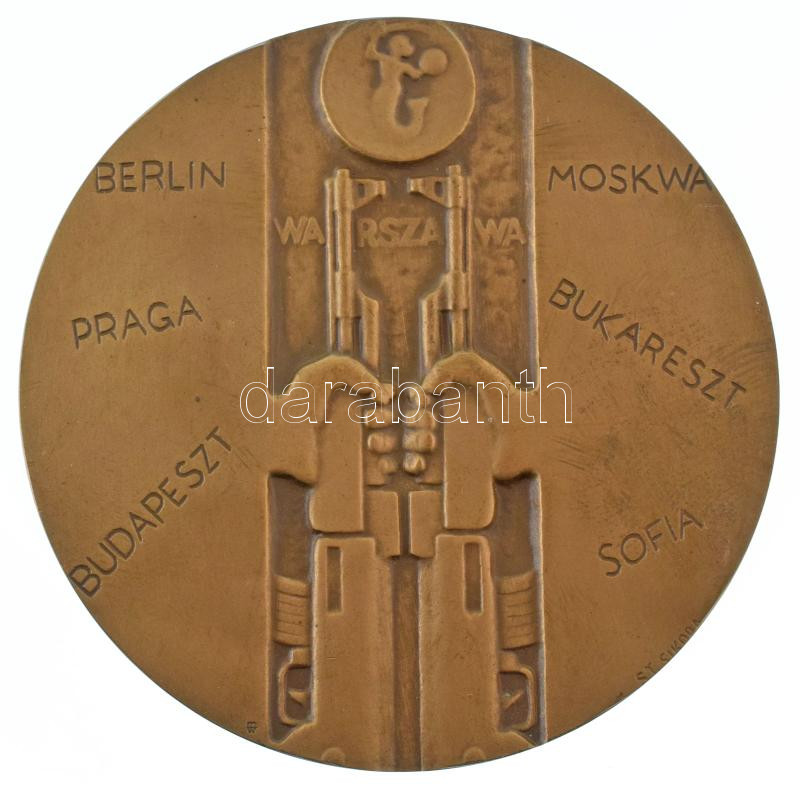 Poland 1980. "Ukladu Warszawskiego 25 lat / Warszawa - Berlin - Praga - Budapeszt - Moskwa - Bukareszt - Sofia" two-sided bronze commemorative medallion. Sign.: "ST SIKORA" (70mm) C:XF,VF