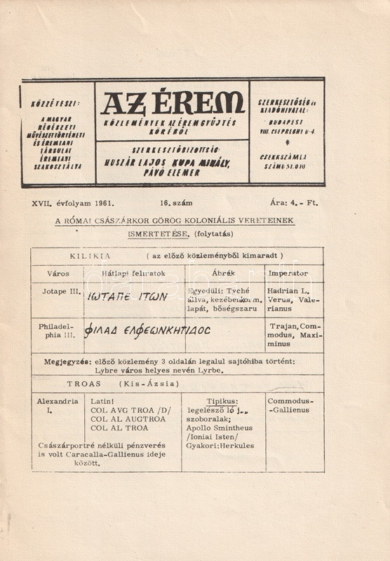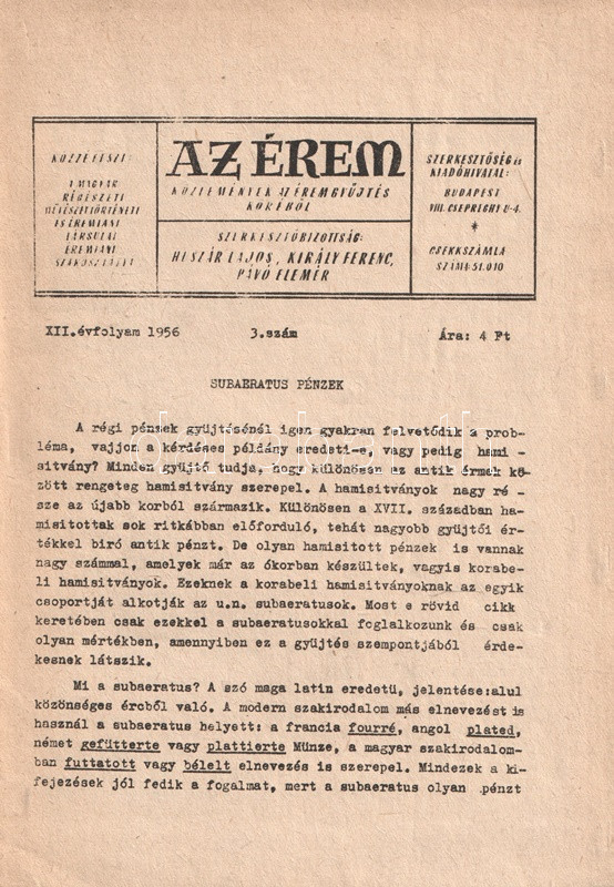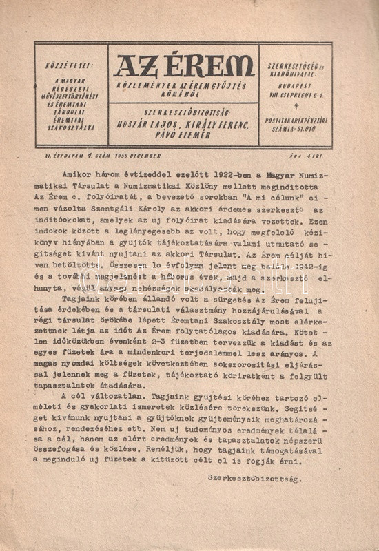 Budapest, 1955-1963. Magyar Régészeti, Művészettörténeti és Éremtani Társulat Éremtani Szakosztálya (Múzeumok Rotaprint Üzeme). A lapszámok terjedelme kezdetben 16, később 24 oldal.