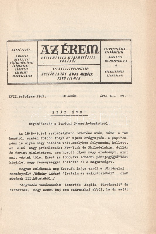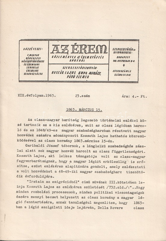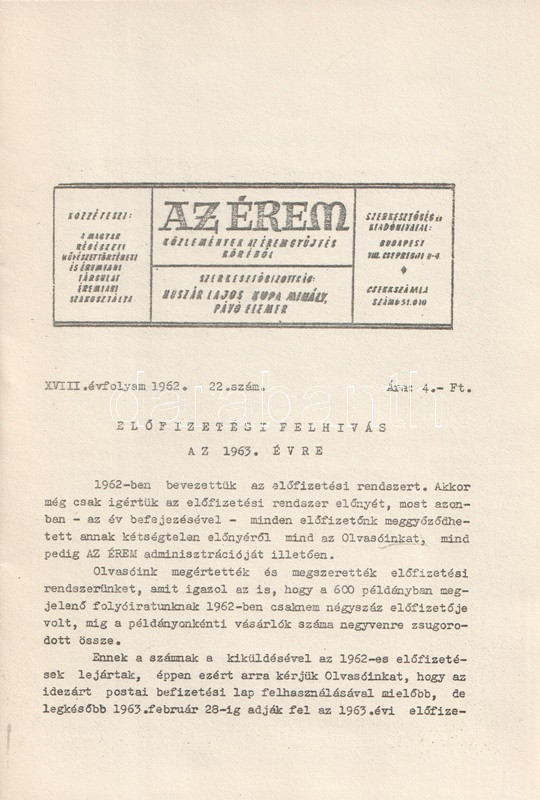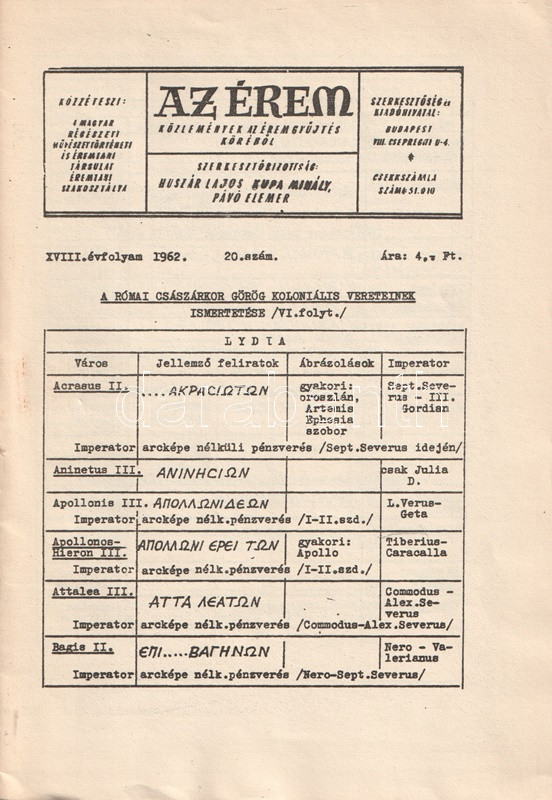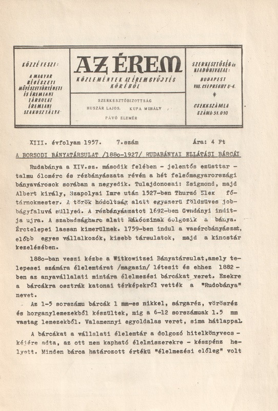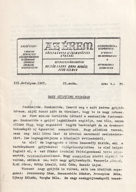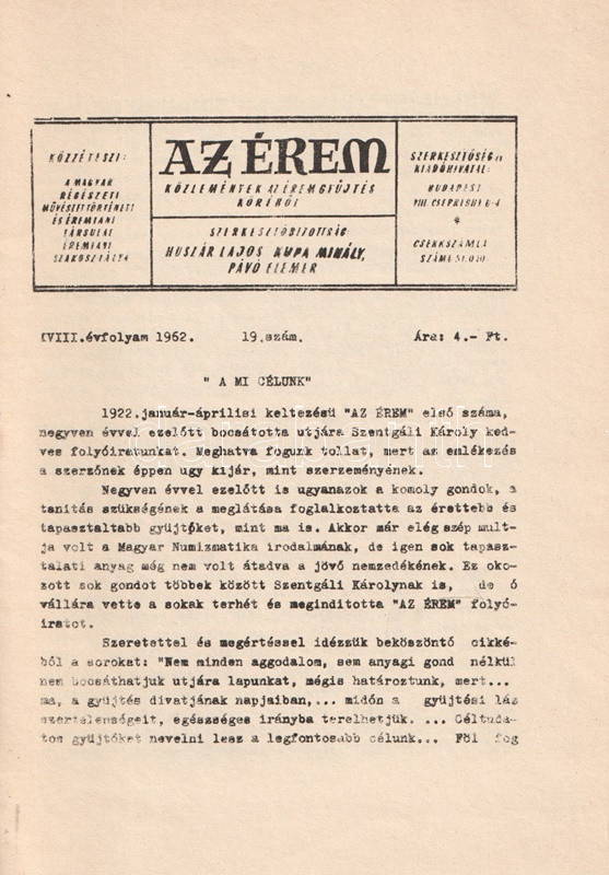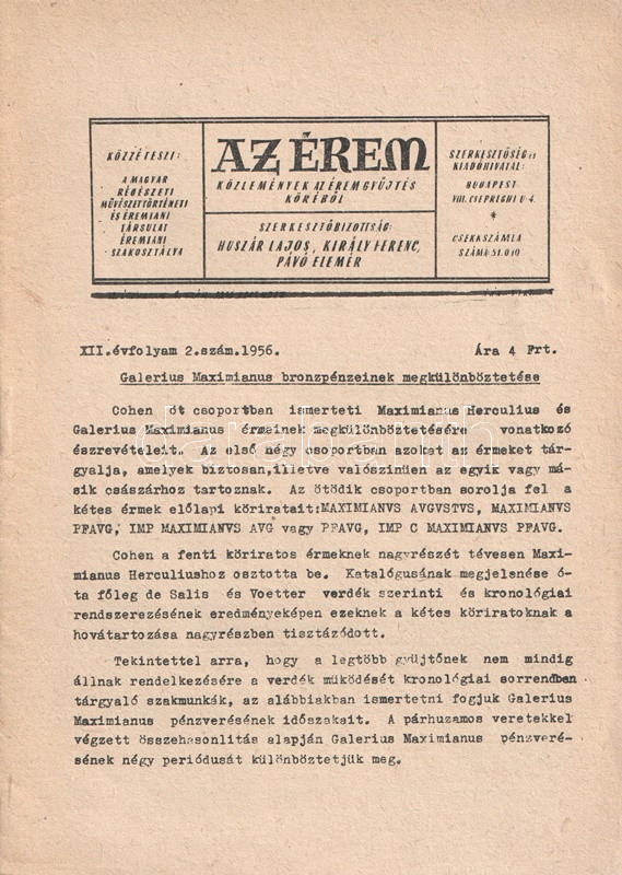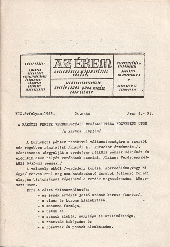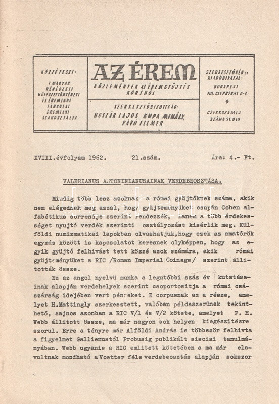 Az Érem. Közlemények az éremgyűjtés köréből. Szerkeszti Huszár Lajos, Király Ferenc, Kupa Mihály és Pávó Elemér. 14 lapszám a XI-XIX. évfolyamból. (1955-1963).
