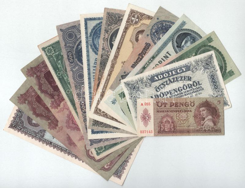 Leírás: Vegyes, 13xklf Pengő és Forint bankjegytétel, közte 1969. 20Ft hátoldalán nyomdai festékfolttal T:XF-F szép papír, közte folt