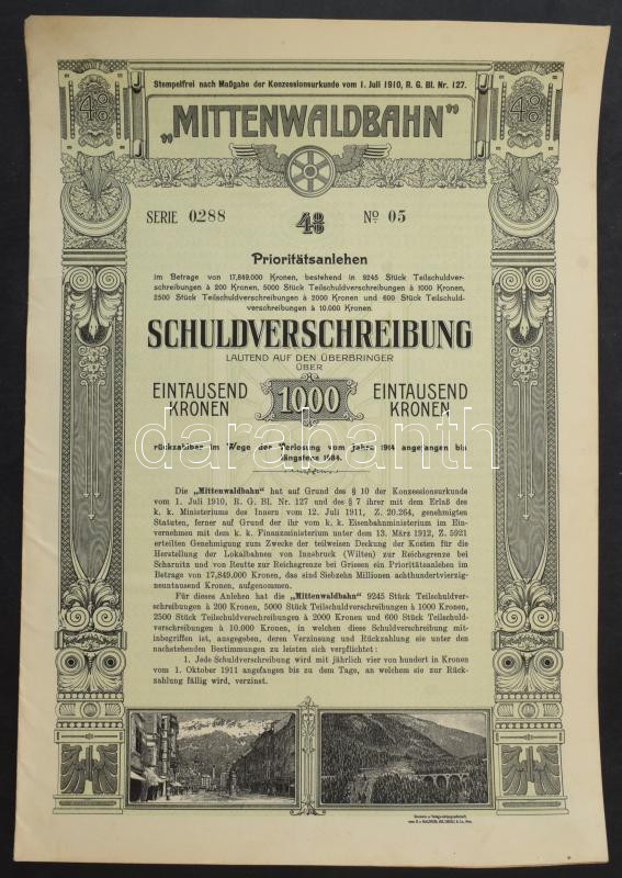 Ausztria / Innsbruck 1912. "Mittenwaldbahn (Innsbruck-Garmisch-Partenkirchen-vasútvonal)" jelzálogkötvény 1000K-ról, szelvényekkel T:VF Austria / Innsbruck 1912. "Mittenwaldbahn" debenture bond about 200 Kronen, with coupon C:VF