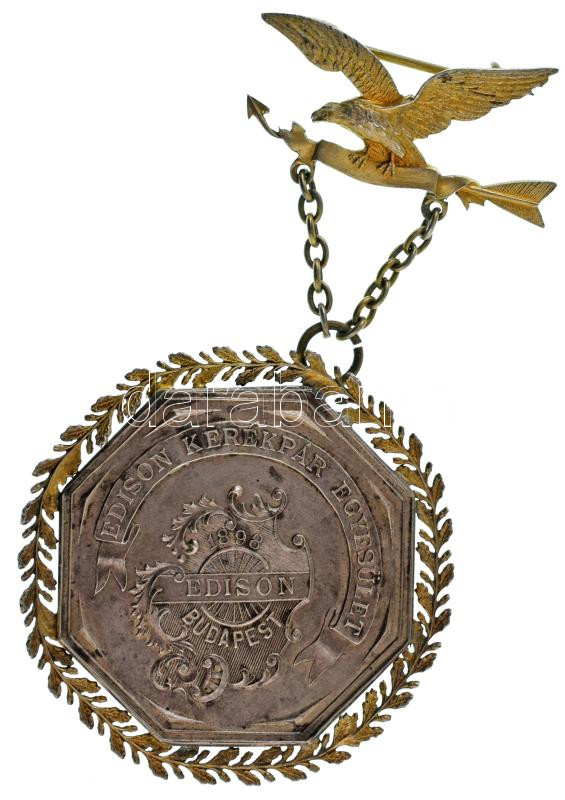 1900 k. "Edison Kerékpár Egyesület" jelzett Ag díjérem díszítménnyel és sas ábrázolású díszítménnyel, "S.G.A. (Scheid Ezüstáru- és Éremgyár)" gyártói jelzéssel (bruttó 48,54g/0.800/47mm) T:XF