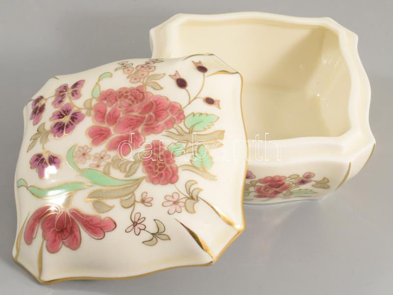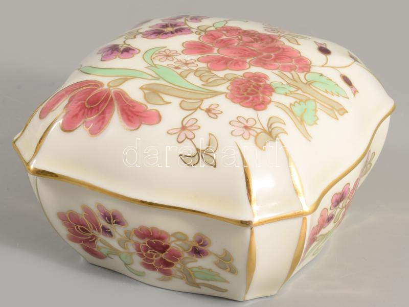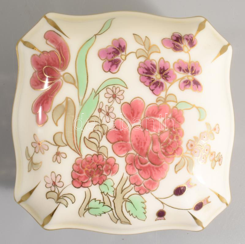 Leírás: Zsolnay aranykontúrozott virágmintás bonbonier, jelzett, hibátlan, 10,5x10,5 cm