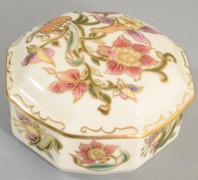 Zsolnay aranykontúrozott virágmintás bonbonier, jelzett, hibátlan, d: ... https://www.darabanth.com/hu/513-Filatelia-kepeslap-numizmatika-mutargy-konyv-papirregiseg-ekszer-aukcio/513.0/Porcelan-keramia-uveg/Porcelan~78/Zsolnay-aranykonturozott-viragmintas-bonbonier-jelzett-hibatlan-d-9-cm~II3465895
