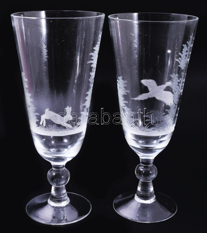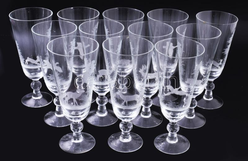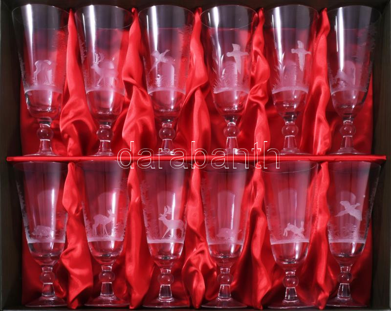Leírás: 12 személyes csiszolt vadászmintás kristályüveg talpas pohár garnitúra, hibátlan, m: 19 cm, díszdobozban.