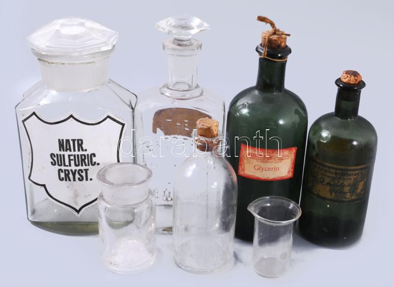 Leírás: 6 darab gyógyszertári üveg és laborüveg, közte feliratos.