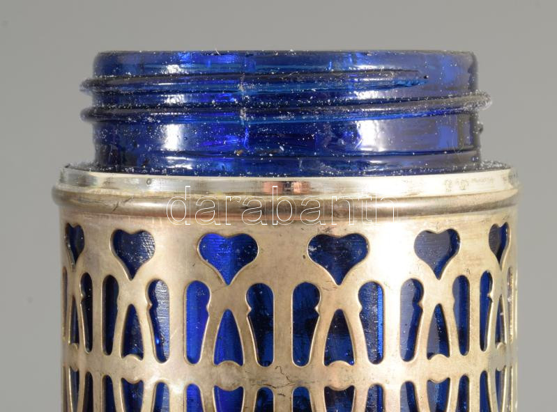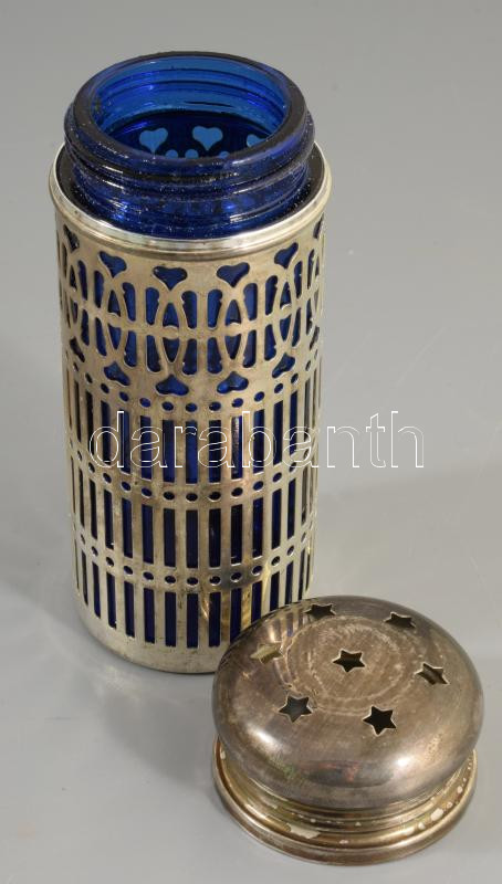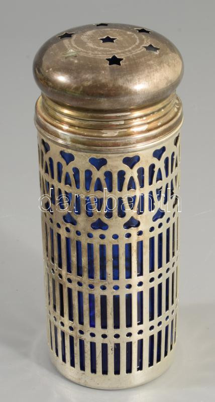 Leírás: Angol királykék üveg kakaószóró, ezüstözött fém szerelékben, jelzett, m: 13 cm