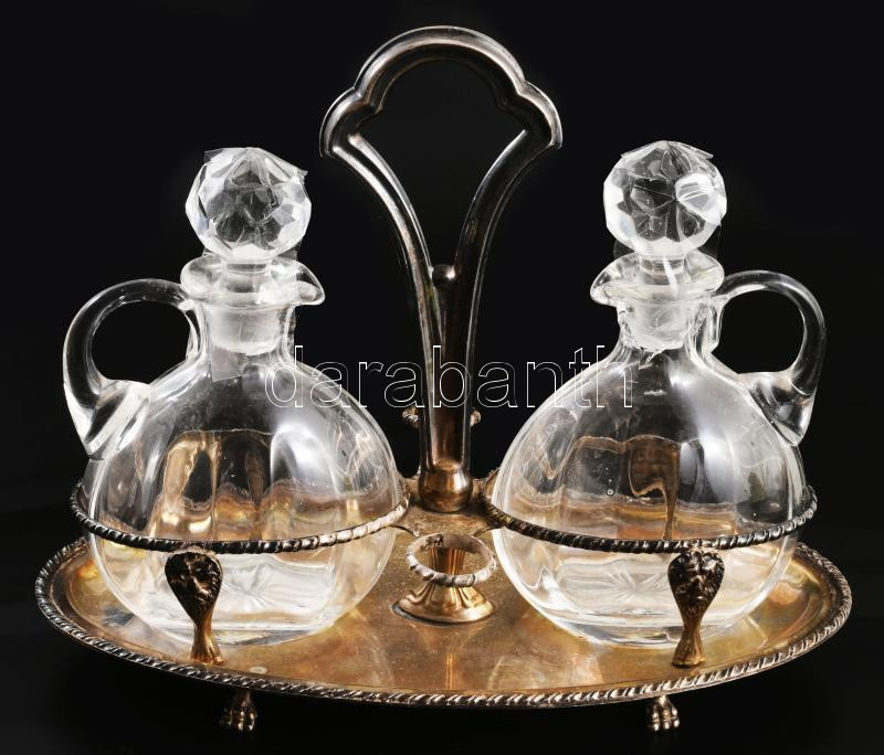 Antik ezüstözött olaj-ecet tartó, 2 üveggel, 23x17 cm https://www.darabanth.com/hu/513-Filatelia-kepeslap-numizmatika-mutargy-konyv-papirregiseg-ekszer-aukcio/513.0/Porcelan-keramia-uveg/Uvegtargyak~79/Antik-ezustozott-olaj-ecet-tarto-2-uveggel-23x17-cm~II3470480