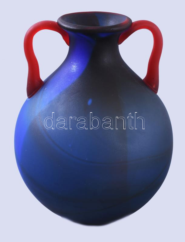 Antik kéküveg váza, vörösüveg fülekkel, anyagában színezett savmaratot... https://www.darabanth.com/hu/513-Filatelia-kepeslap-numizmatika-mutargy-konyv-papirregiseg-ekszer-aukcio/513.0/Porcelan-keramia-uveg/Uvegtargyak~79/Antik-kekuveg-vaza-vorosuveg-fulekkel-anyagaban-szinezett-savmaratott-uveg-jelzes-nel~II3473470