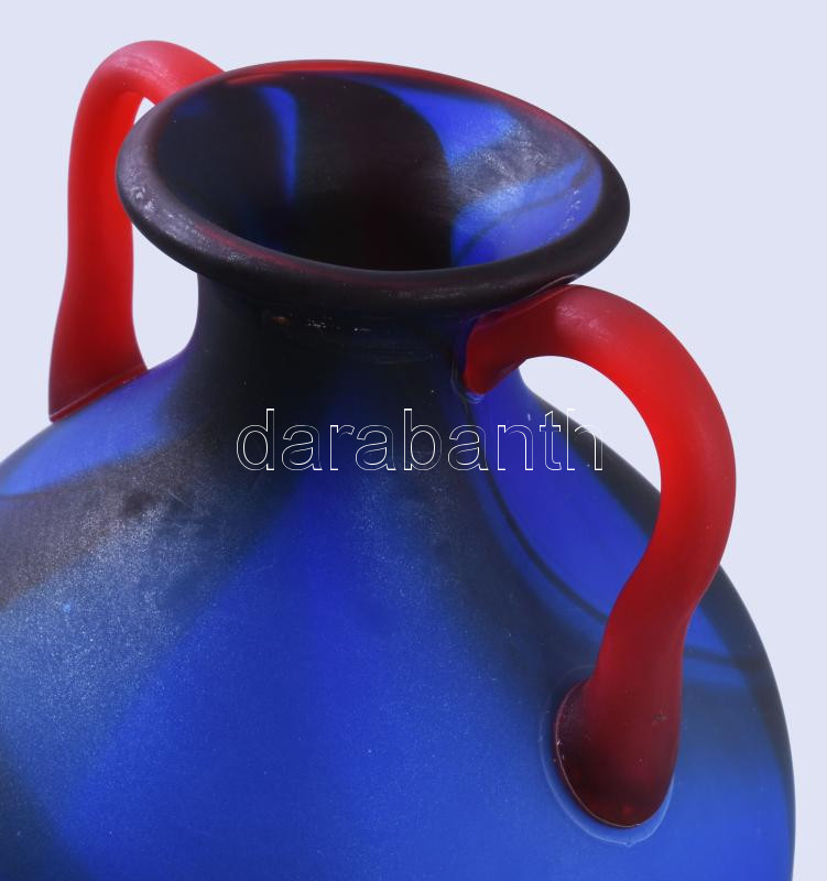 Leírás: Antik kéküveg váza, vörösüveg fülekkel, anyagában színezett savmaratott üveg, jelzés nélkül, hibátlan, m: 20,5 cm