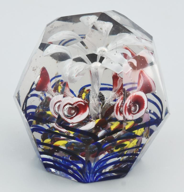 Bohemia levélnehezék. Öntött üveg, körbehúzott száldíszítéssel körbevett beleolvasztott virágcsokor felépítménnyel, ékkőszerűen lapokra fazettált, jelzés nélkül, cca 20. sz. első fele, lepattanásokkal, m: 8,5 cm