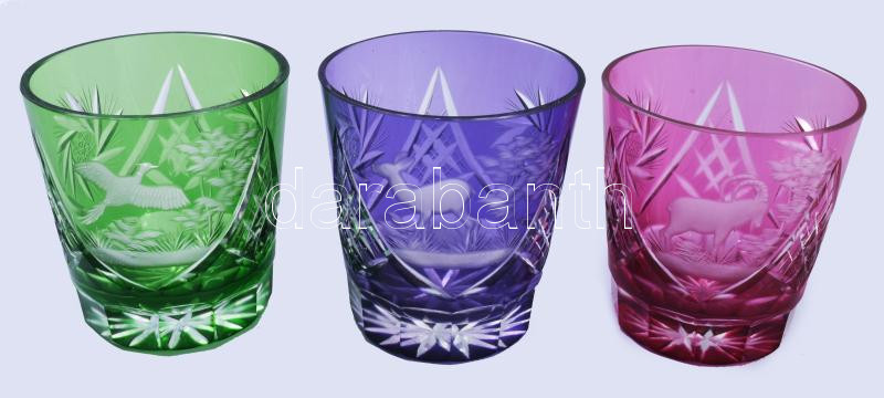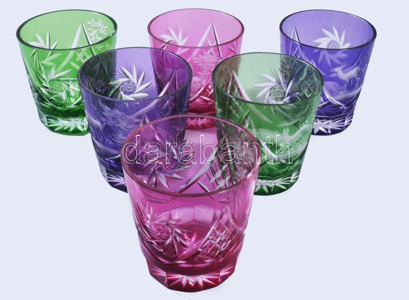 Leírás: Színesen pácolt vadászmotívumos kristály pohár szett, 6 darab, hibátlan, m: 8,5 cm