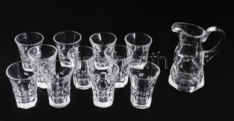 Leírás: cca 1910-1930 10 személyes csiszolt kristály röviditalos garnitúra, kiöntővel, m: 5-10 cm