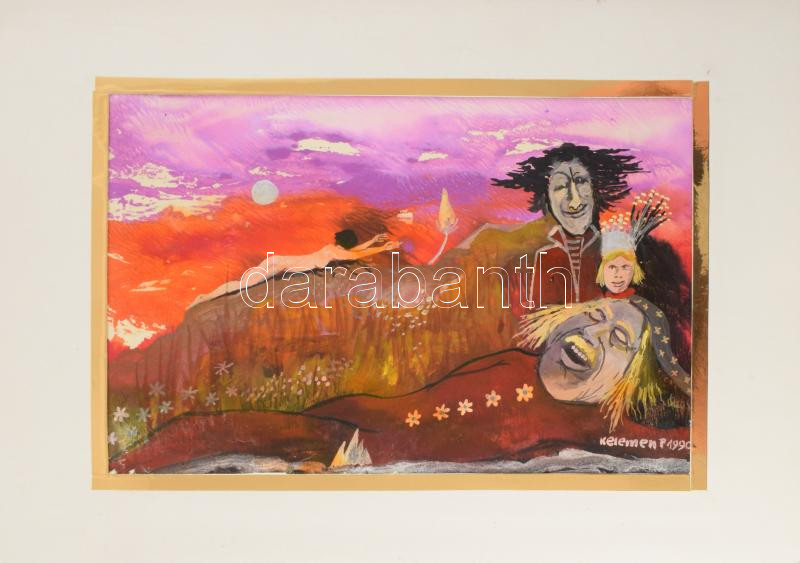 Leírás: Kelemen P. jelzéssel: Szürrealista kompozíció (cím nélkül), 1990. Vegyes technika, papír. Paszpartuban. 23x36 cm